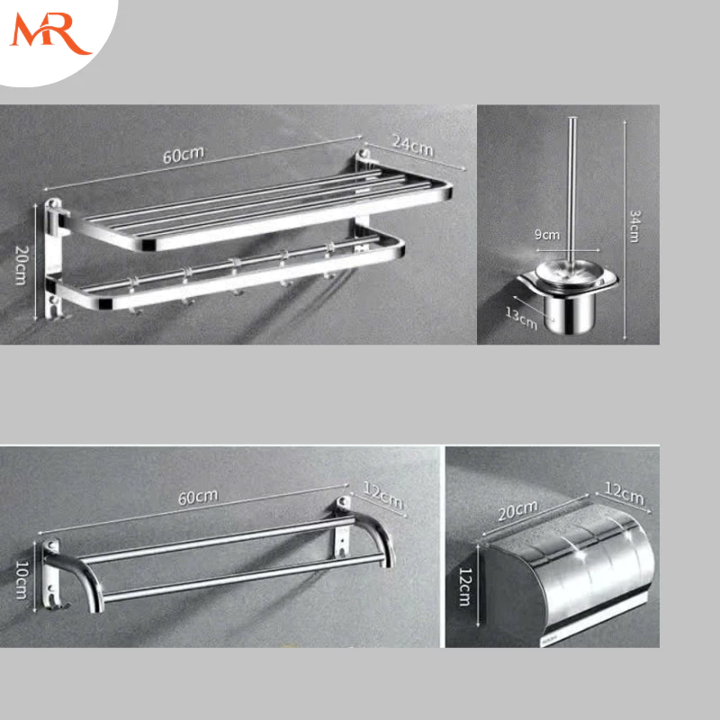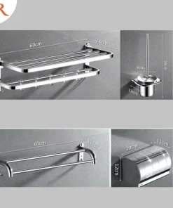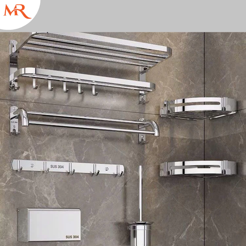 Bộ Phụ Kiện 6 món Phòng Tắm Cao Cấp Miric – Giá Vắt Khăn Gấp Gọn 90°, 5 Móc Treo, Dài 60cm, Hộp giấy, Kệ góc để đồ, Cọ vệ sinh